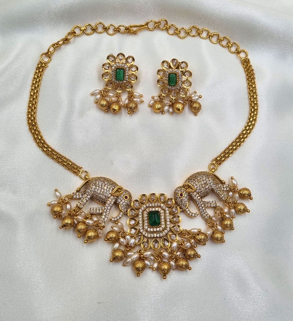 Haram PW | Gold Green Haram Necklace Set – South Indian Bridal Jewelry