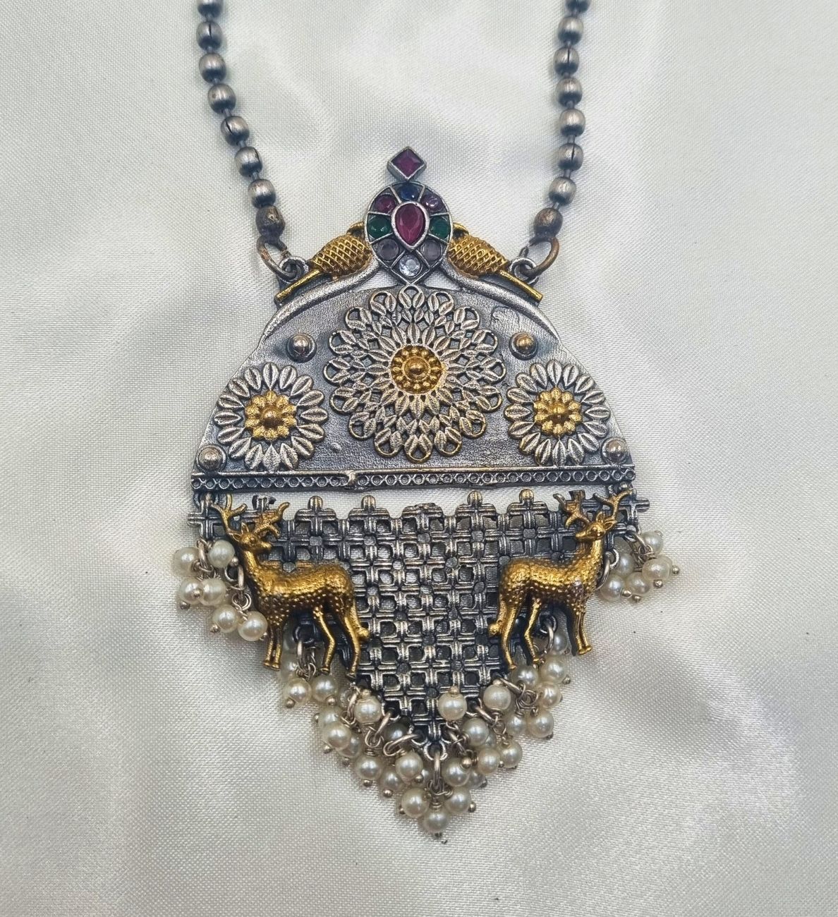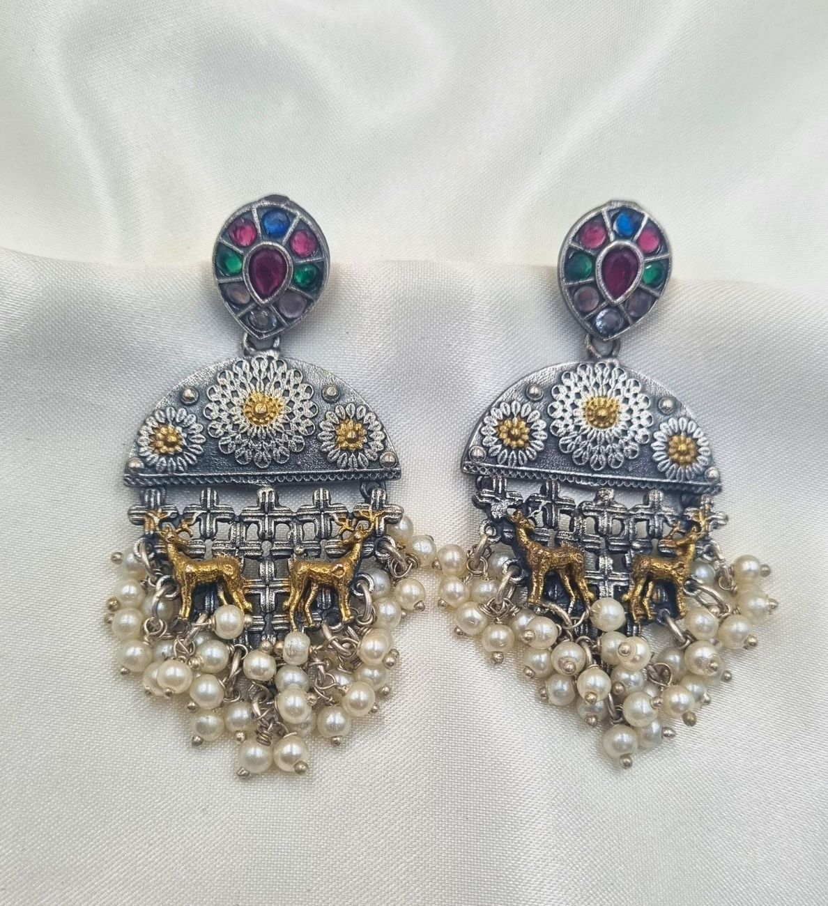 Introducing the Gazelle Jewel Set – a stunning blend of antique charm and contemporary elegance. Crafted in dual-tone brass with an antique silver finish, this exquisite set features vibrant multi-color accents that add a touch of timeless allure to any outfit. Perfect for making a statement, this set is a versatile addition to your jewelry collection.35 CM LongEarrings: 6 CM