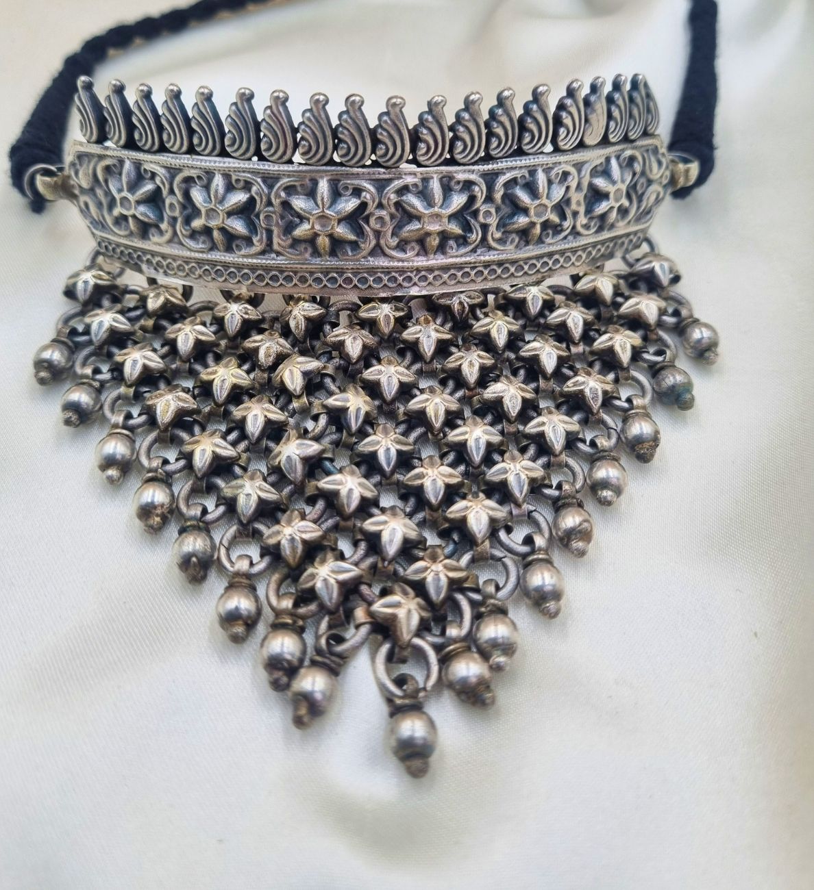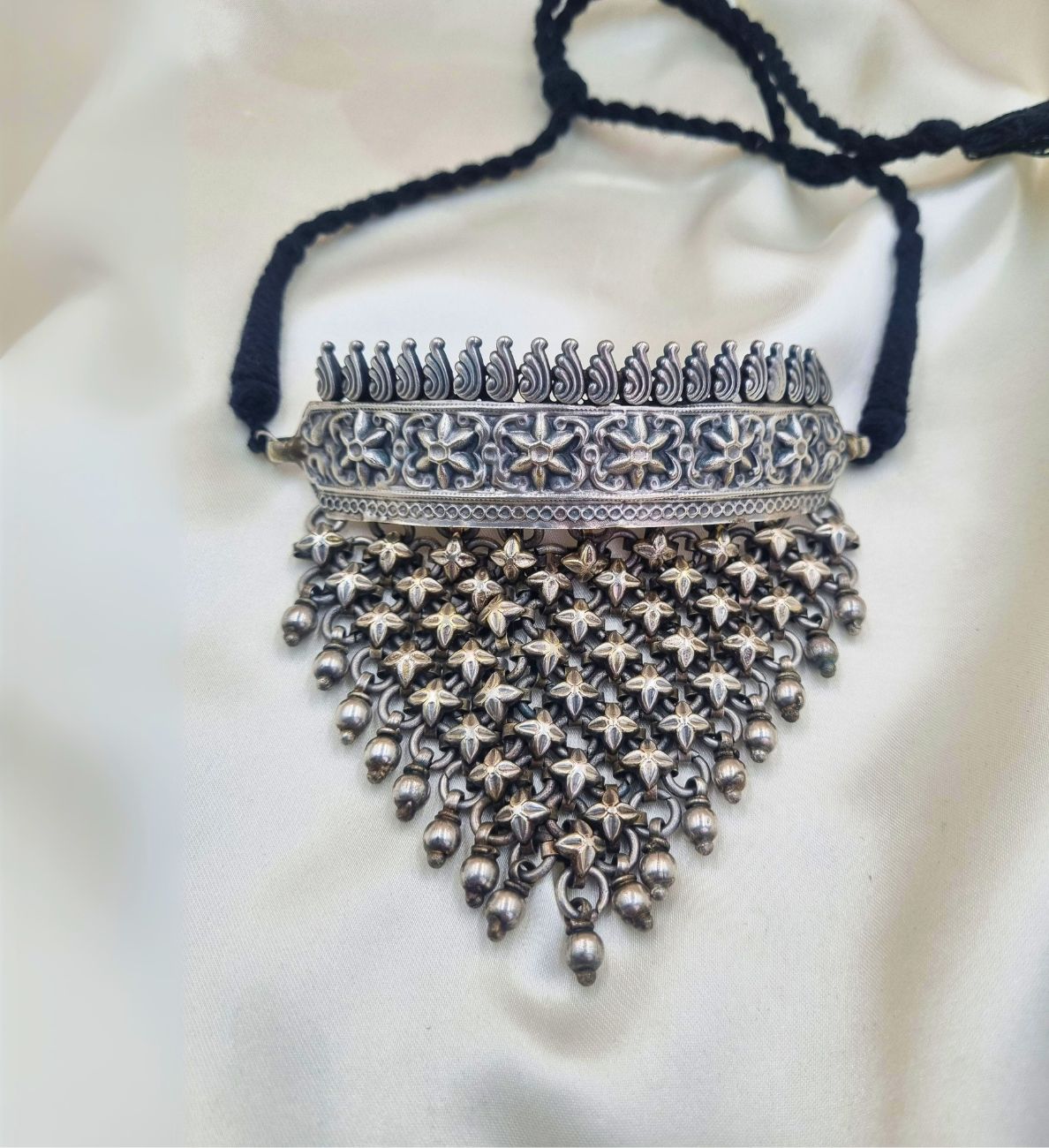 Introducing our Silver Charm Choker Hasli, the perfect blend of elegance and versatility. This stunning piece is designed to elevate any look, from festive celebrations to casual outings and even wedding ensembles.