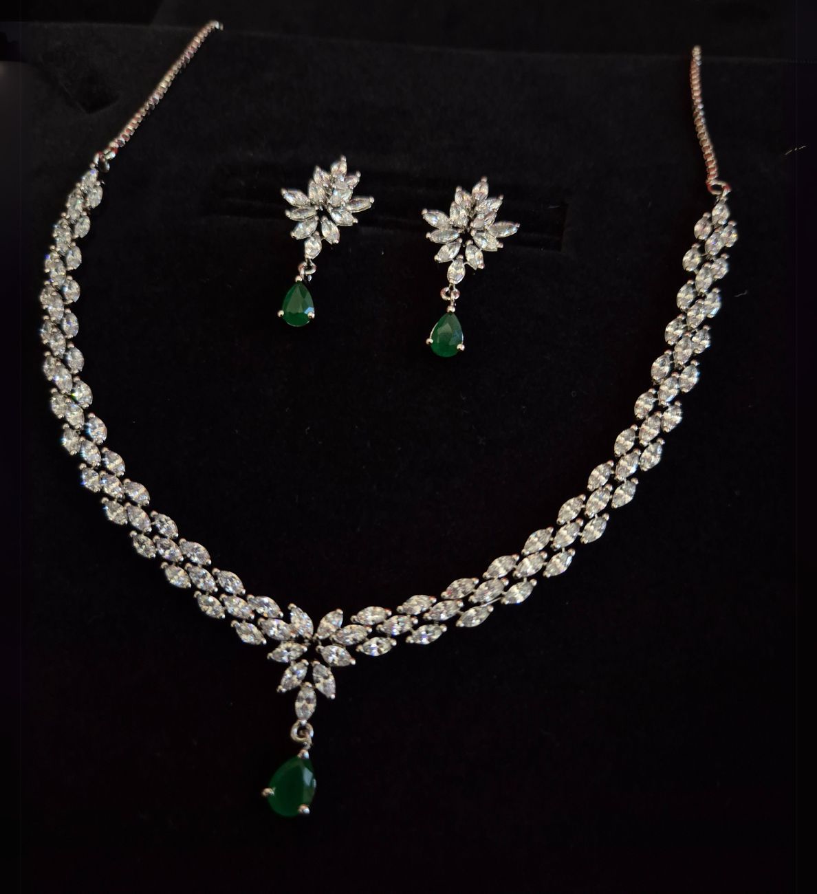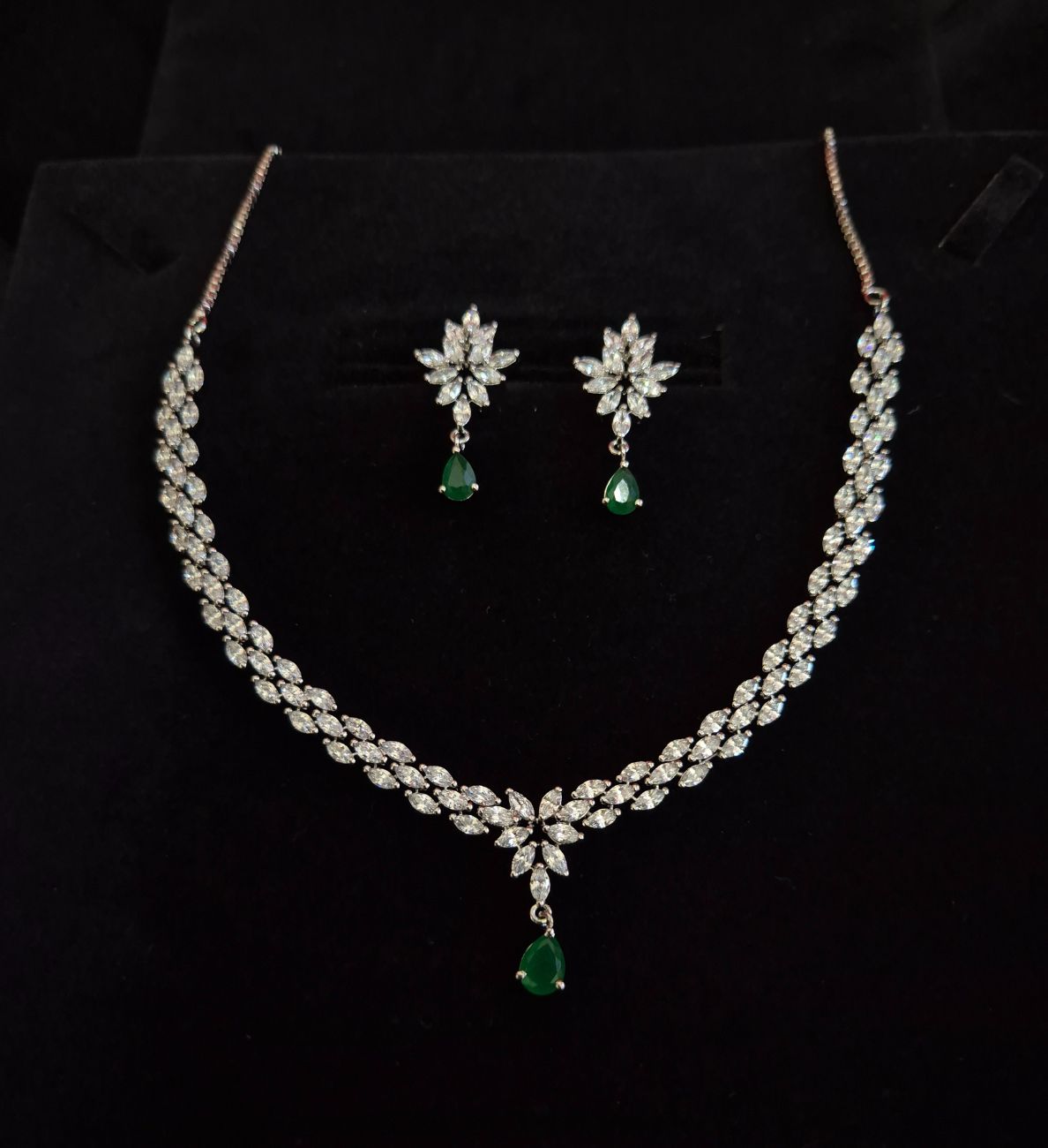 an all-time favourite design that exudes timeless charm. Crafted with delicate precision, this classy neckpiece set features dazzling Zircon stones, adding a touch of sophistication to any outfit. Perfect for those searching for diamond look studs.