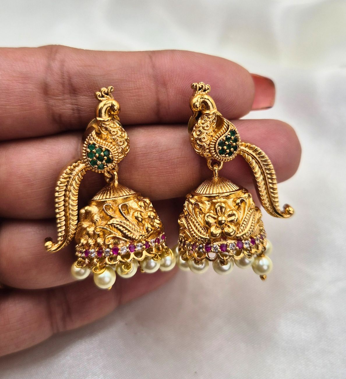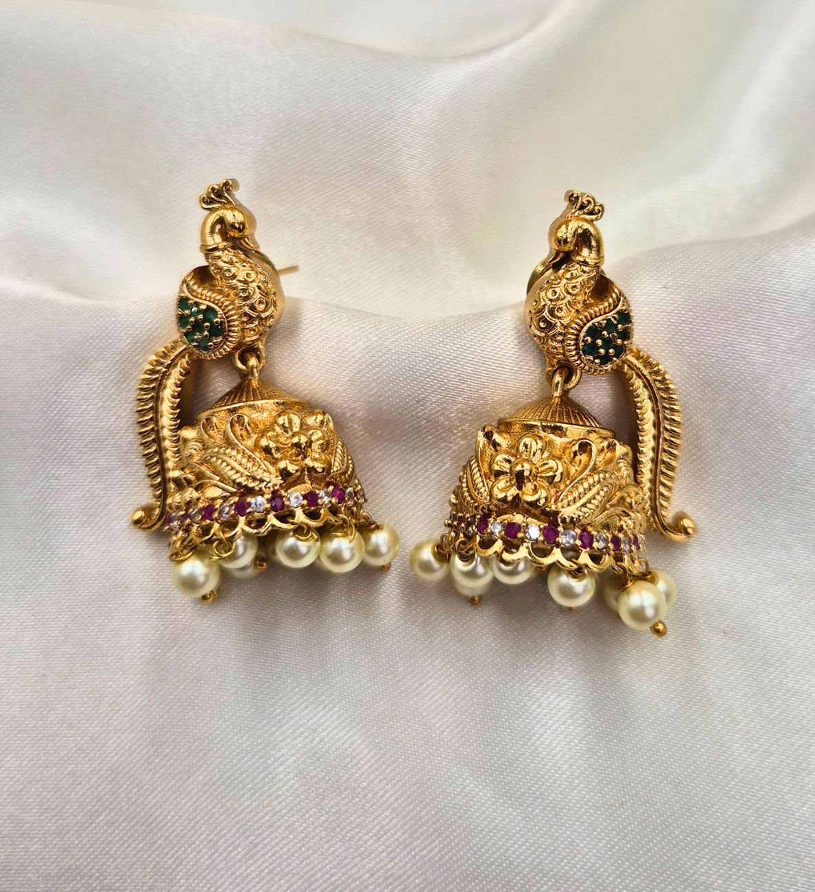 • Intricately crafted peacock motif top with gold-plated jhumka bottom