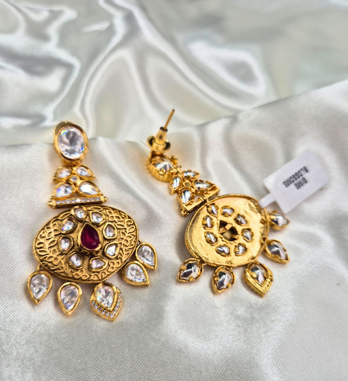 Mandakini premium kundan earrings feature a rich antique finish that reflects timeless royal elegance. Designed with intricate craftsmanship and traditional detailing, this piece is perfect for weddings, festive occasions, and grand celebrations. Ideal for those searching for antique kundan earrings Dubai, bridal jewelry UAE, traditional ethnic earrings, and royal statement jewelry for women.