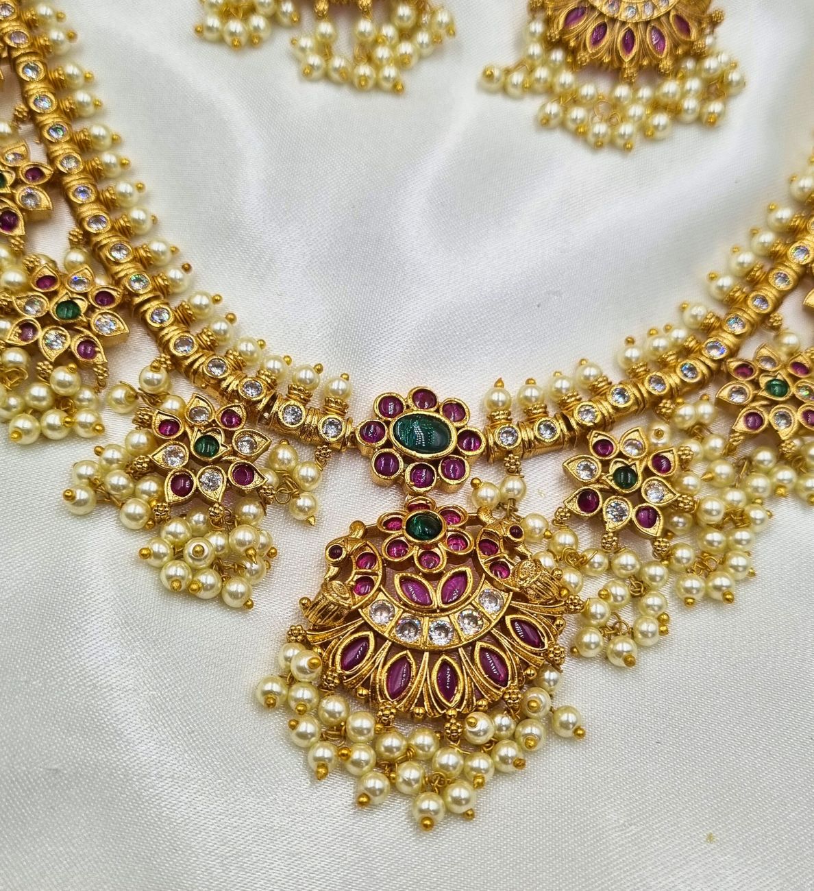 Elevate your style with our exclusive handcrafted Kemp stone neckpiece set, a perfect blend of tradition and contemporary flair. This statement piece is a must-have for women who appreciate timeless beauty and intricate artistry. Each neckpiece is adorned with vibrant red and green Kemp stones, accentuated by shimmering cubic zirconia (CZ) stones that emulate the brilliance of real diamonds. The design showcases intricate motifs inspired by South Indian temple jewellery, making it an ideal choice for weddings, festivals, or special celebrations.