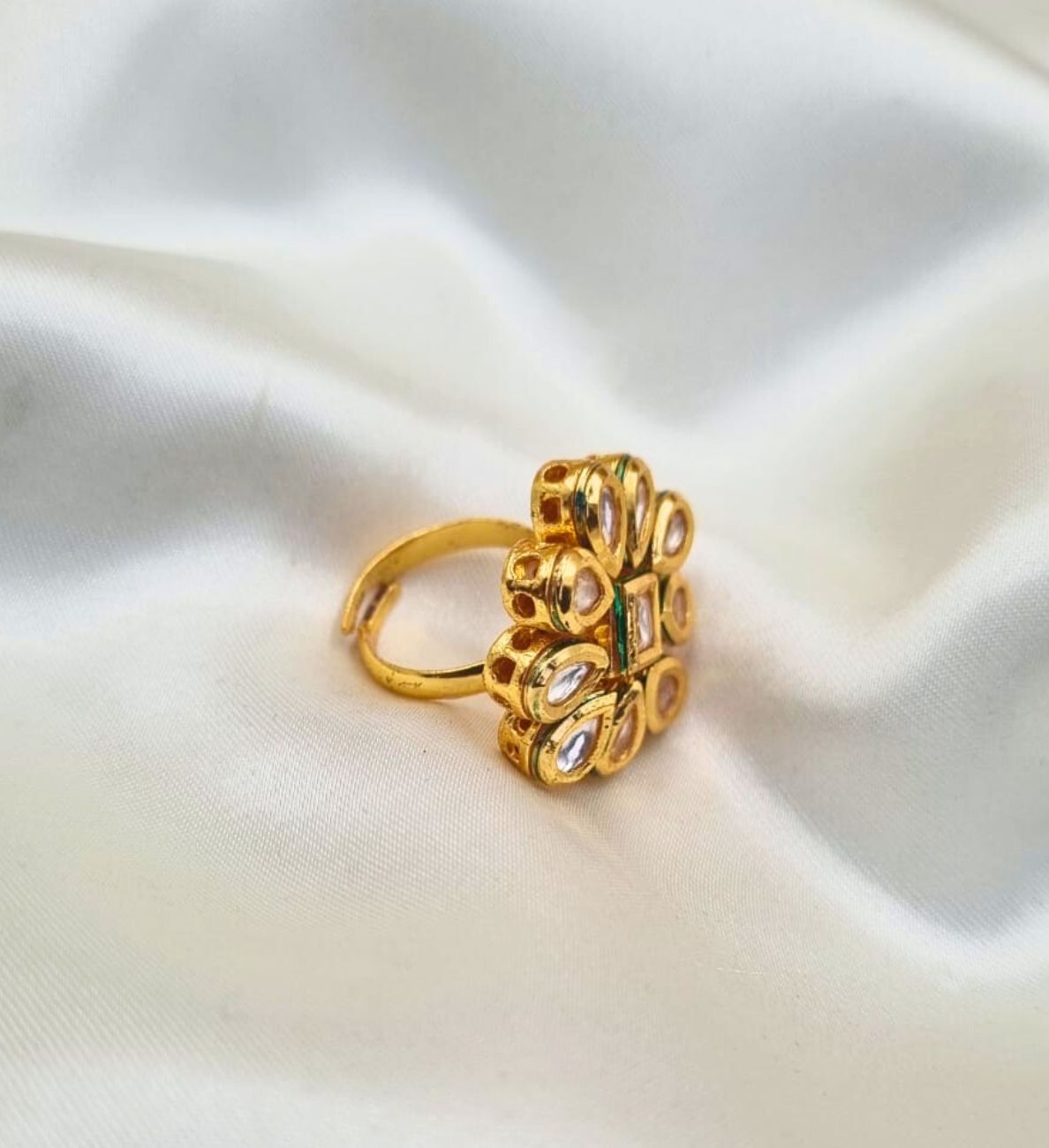Elevate your style with this exquisite Kundan finger ring, crafted with intricate detailing in brass. Perfect for festive occasions, weddings, or even a casual evening out, this adjustable ring ensures a comfortable fit for all. Let this timeless piece add a touch of elegance to your ensemble.